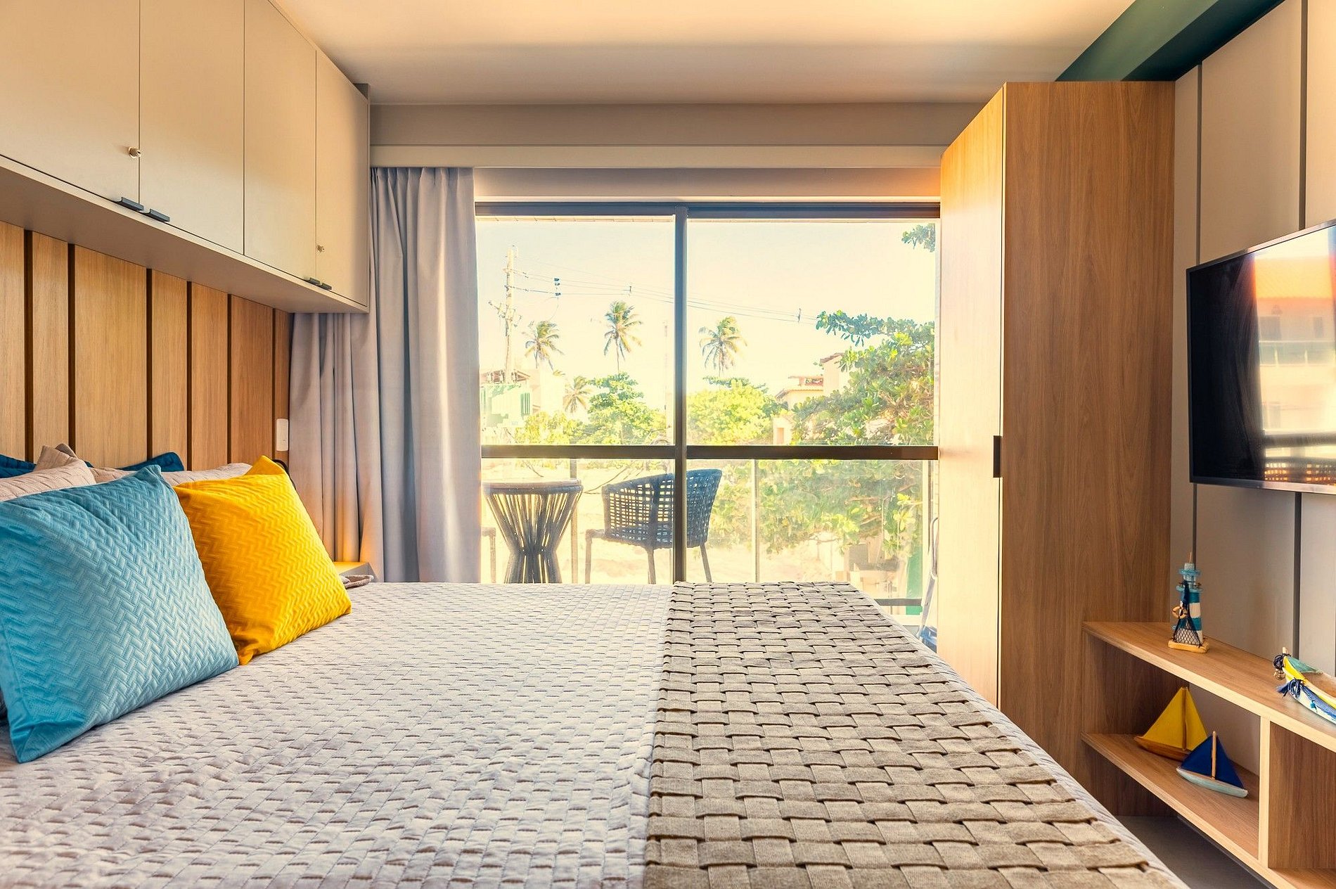 O estudio tem 22m² com cama queem-size e 2 bicamas de solteiro, é finamente decorado com estilo praieiro e tem uma simpática varanda com vista lateral do Mar.