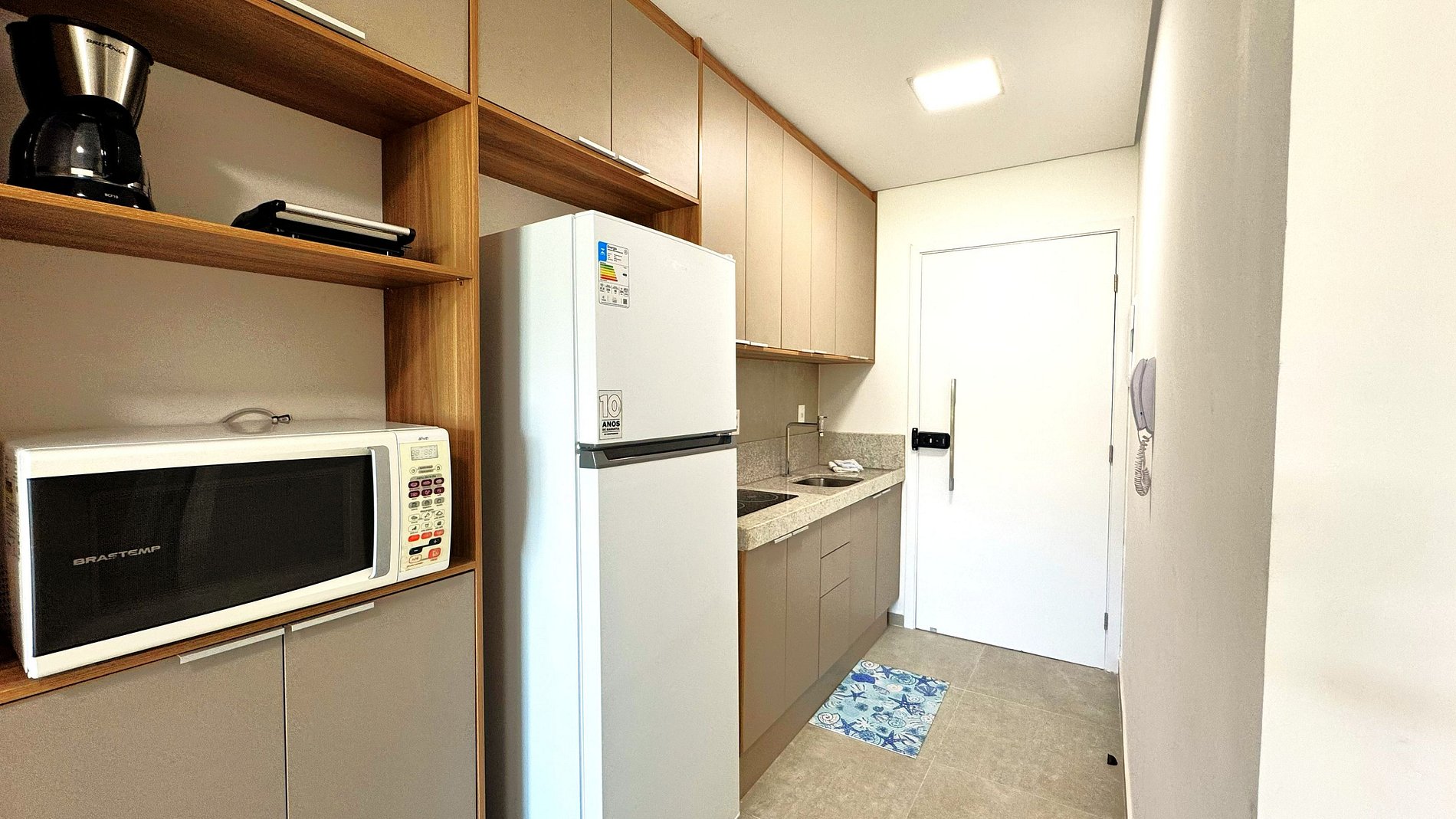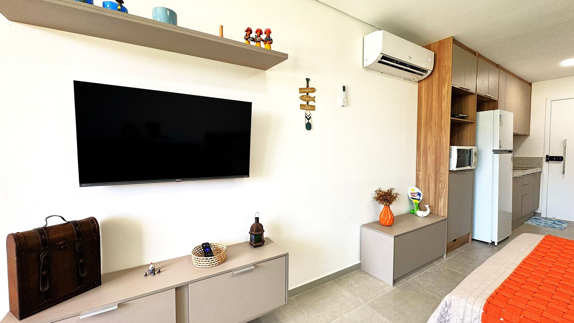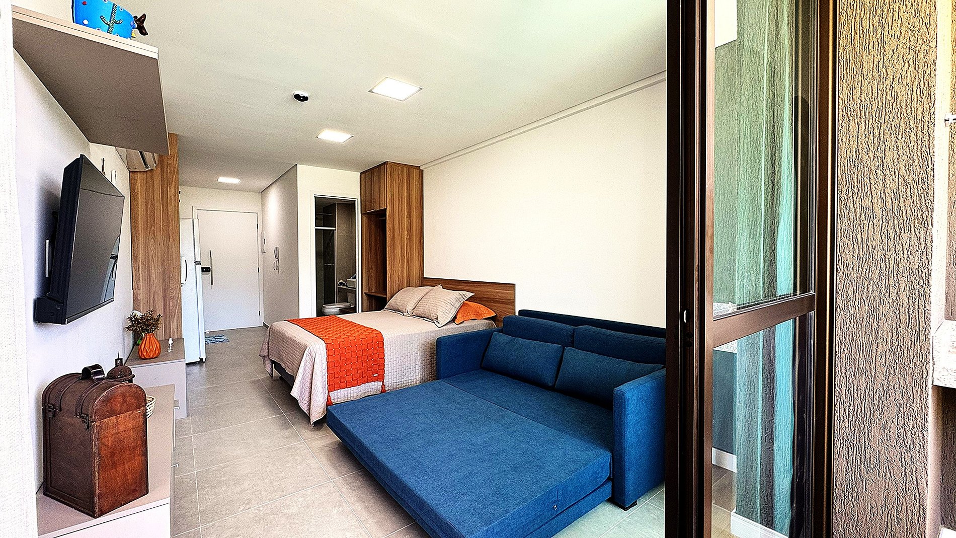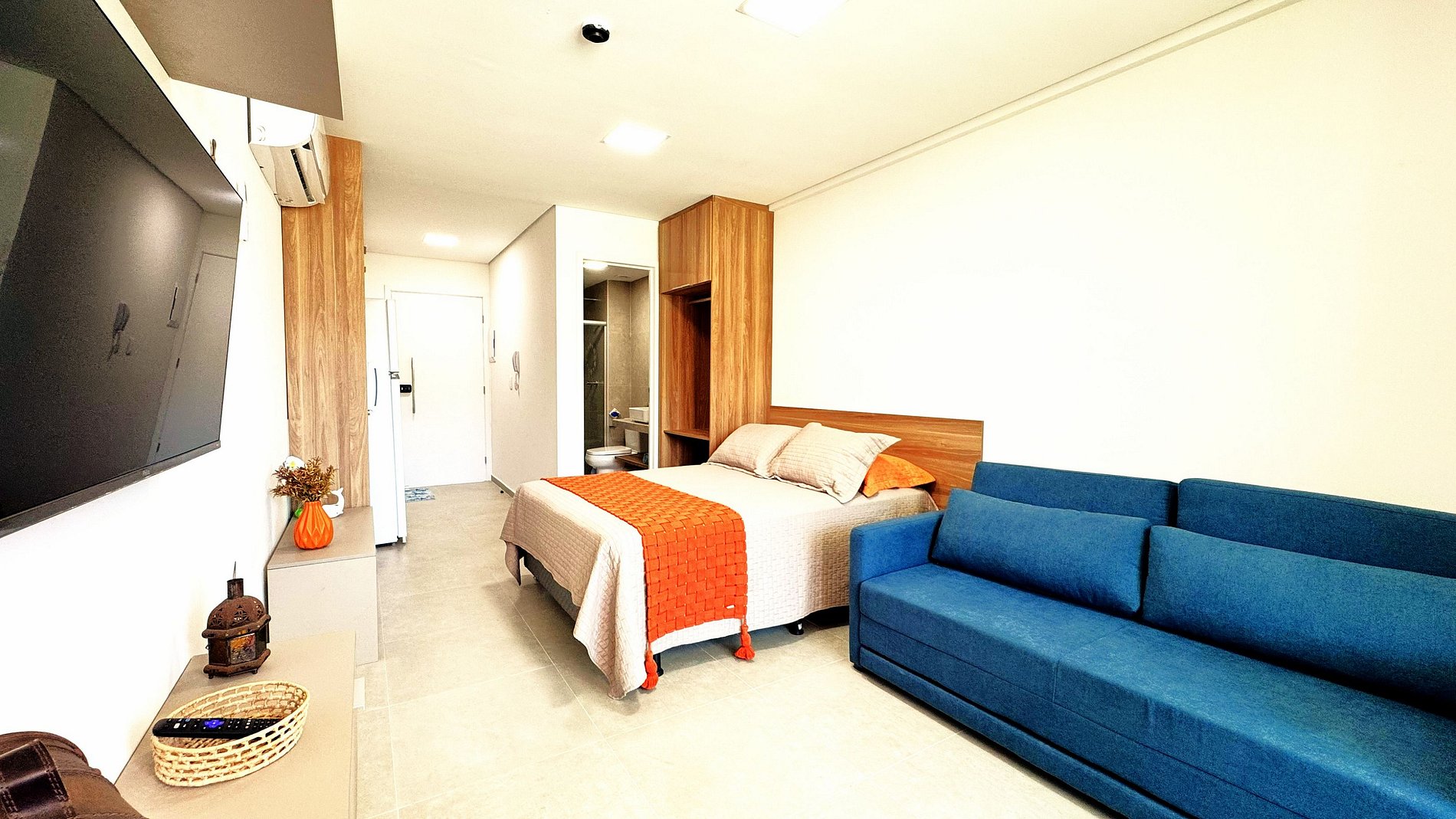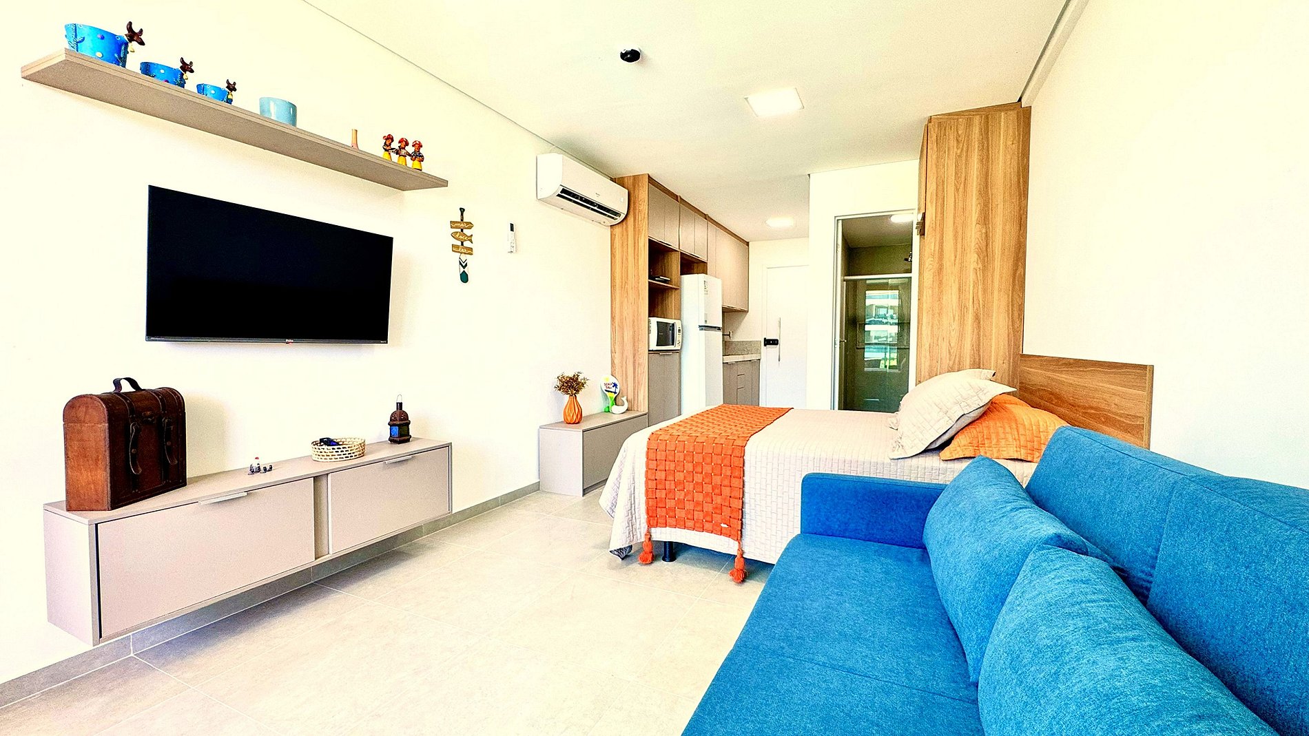 A acomodação foi pensada para oferecer uma estadia funcional e elegante, ideal para casais ou pequenas famílias. O studio conta com ambiente climatizado, cama confortável, TV, Wi-Fi de alta velocidade, além de uma cozinha compacta equipada, perfeita para pequenas refeições durante a estadia. O banheiro é privativo, moderno e bem iluminado.
