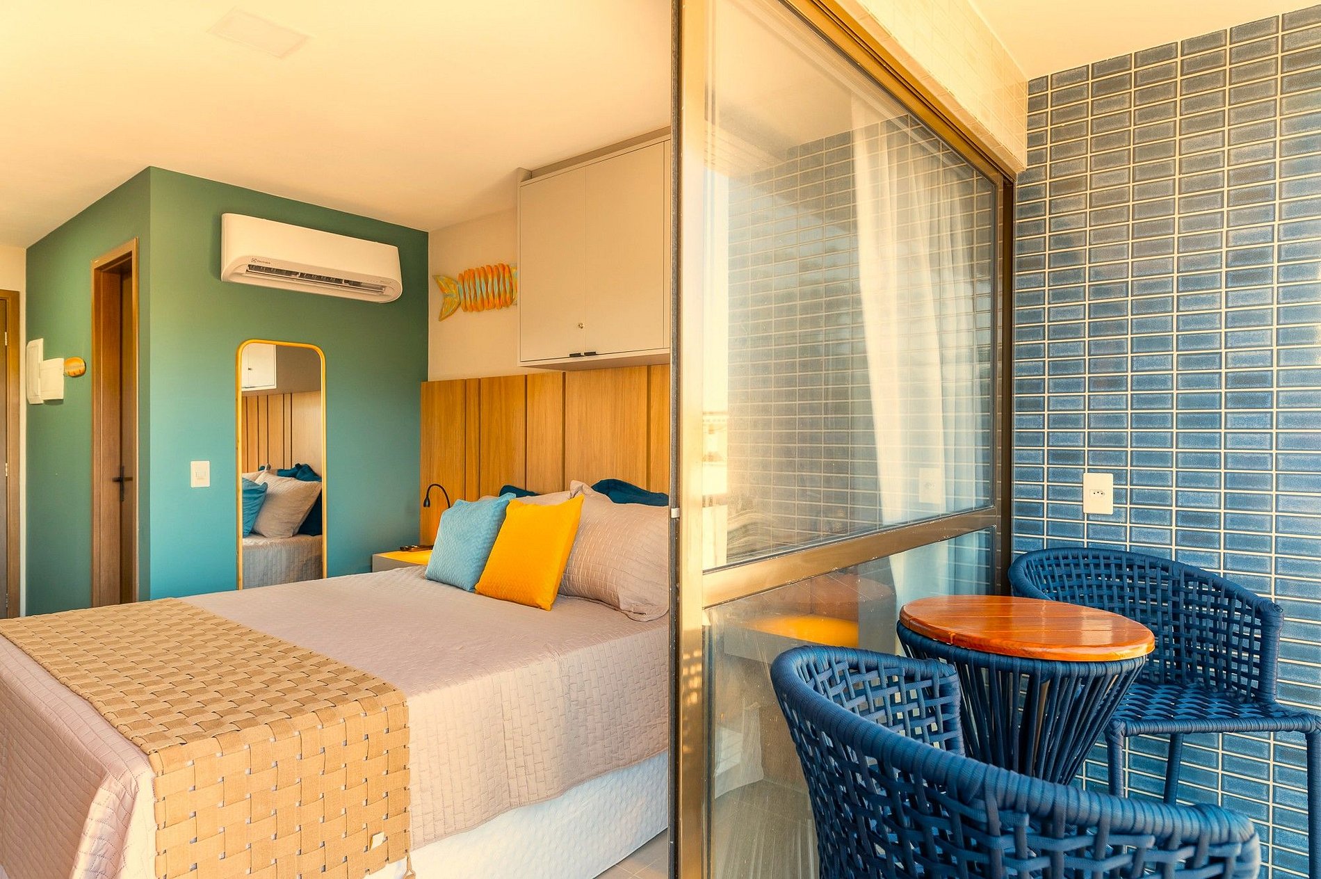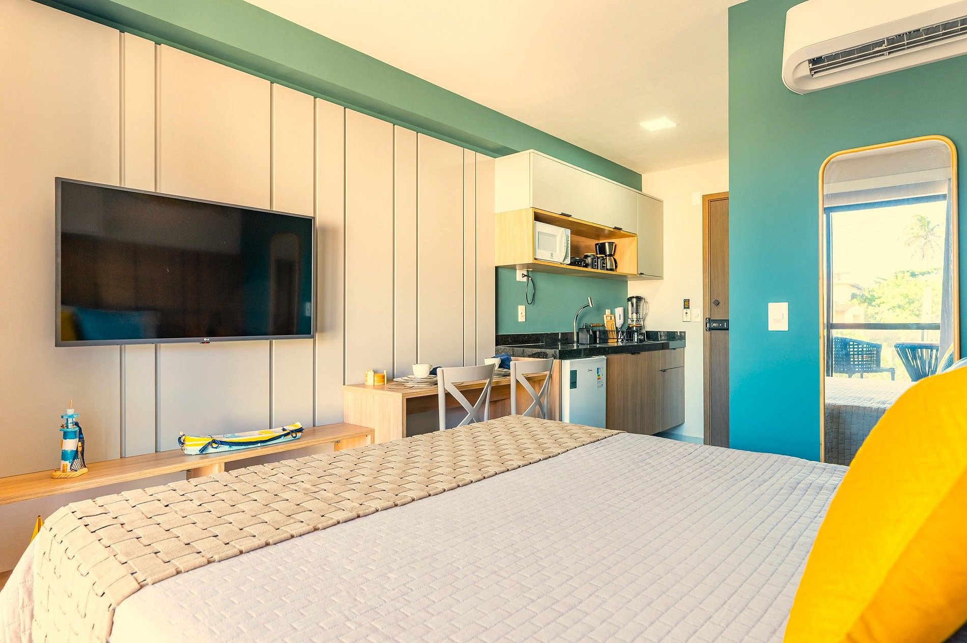O estudio tem 22m² com cama queem-size e 2 bicamas de solteiro, é finamente decorado com estilo praieiro e tem uma simpática varanda com vista lateral do Mar.