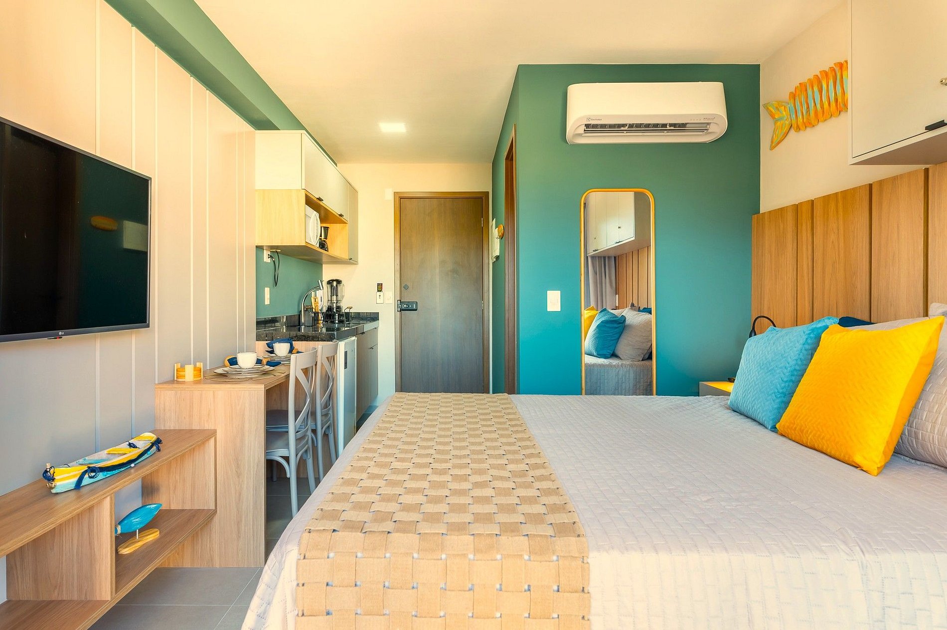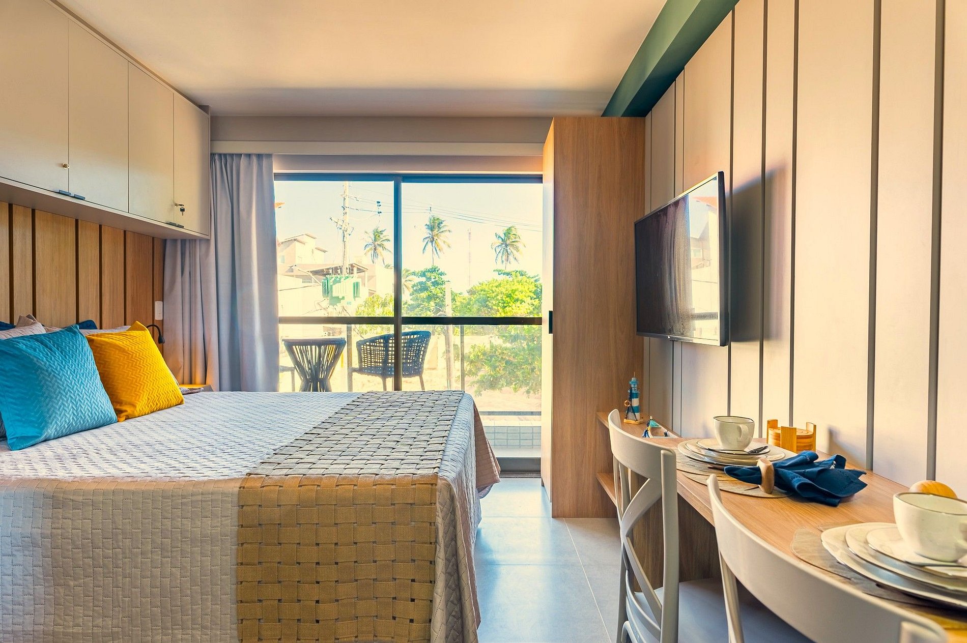 O estudio tem 22m² com cama queem-size e 2 bicamas de solteiro, é finamente decorado com estilo praieiro e tem uma simpática varanda com vista lateral do Mar.